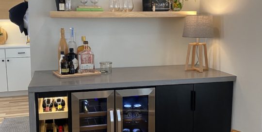 MINI BAR – CONCRETE WATERFALL BAR TOP AND FLOATING SHELVES